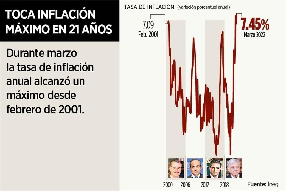 El Índice Nacional de Precios al Consumidor (INPC) aumentó 7.45 por ciento anual en marzo, con lo que la inflación registró su avance más elevado desde el 8.11 por ciento en enero de 2001, de acuerdo con información del Inegi.
