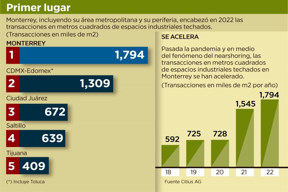 Durante el 2022, Monterrey y sus áreas metropolitana y conurbada fueron por mucho la zona donde más transacciones en metros cuadrados de espacios industriales techados se llevaron a cabo en el País.
