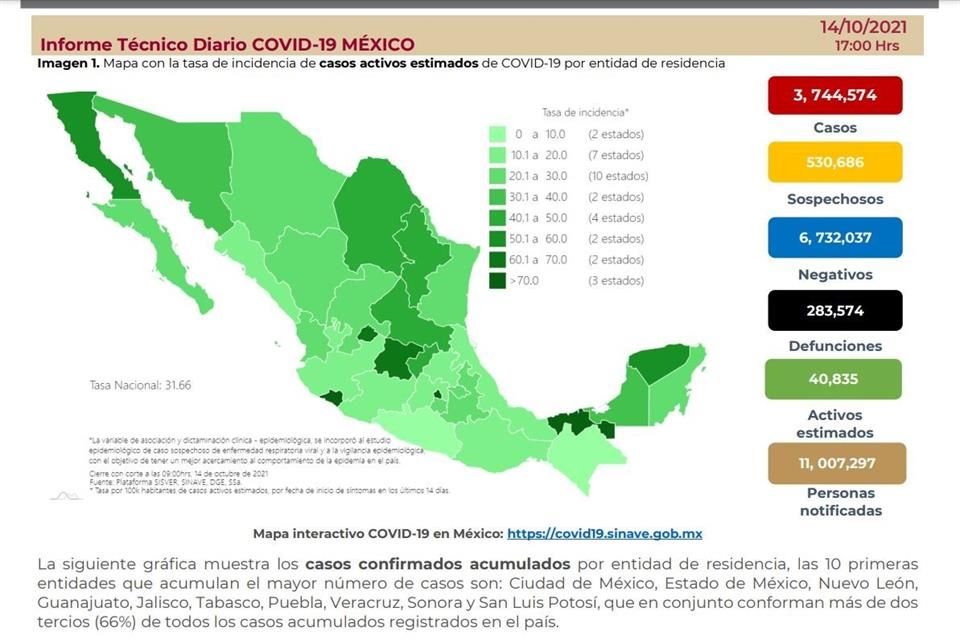 La Secretaría de Salud reportó 381 muertes más por Covid-19 en México, con lo que suman 283 mil 574.