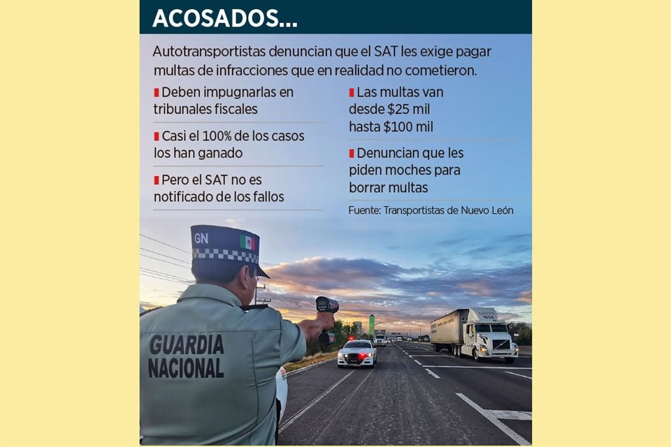 Empresarios del autotransporte de carga en Nuevo León acusaron a autoridades federales de terrorismo fiscal al cobrar multas injustificadas, que van de entre 25 mil y 100 mil pesos por unidad, impuestas por la Guardia Nacional en las carreteras del País en nombre de la Secretaría de Infraestructura, Comunicaciones y Transportes (SICT).