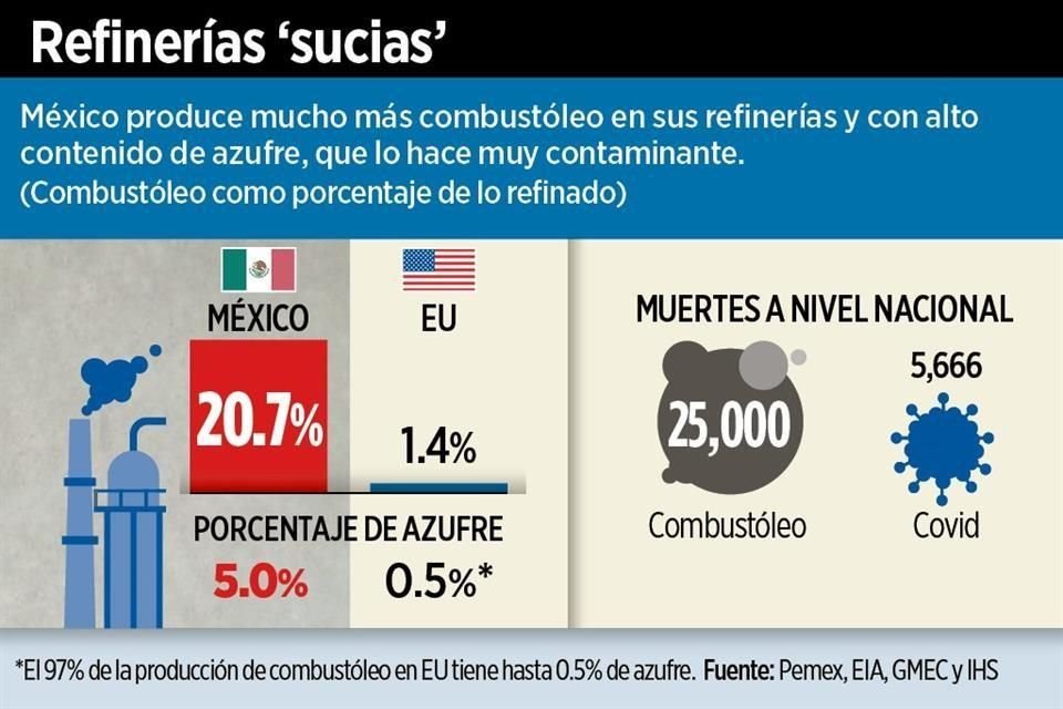 Cada año mueren 25 mil personas de manera prematura a nivel nacional debido al uso de combustóleo, estiman académicos y actores políticos con base en estudios del IPN, la UNAM y el Instituto Mexicano del Petróleo.