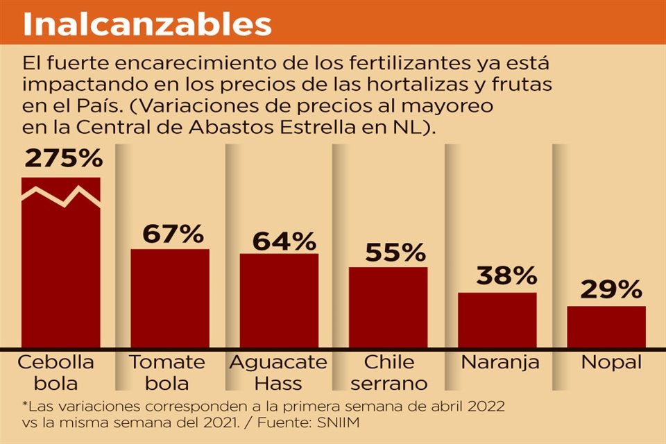 A la primera semana de abril de este año, los precios al mayoreo de una canasta de 25 hortalizas y frutas de alto consumo en Nuevo León promedian un alza anual del 46 por ciento, revelan cifras de la Secretaría de Economía (SE).