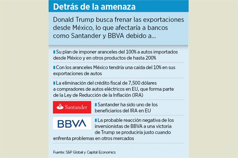 De llegar Donald Trump a un segundo mandato en la Presidencia de Estados Unidos, propiciaría un duro golpe para los mercados de crecimiento de BBVA y Santander, no sólo en aquel país, sino también en México, advirtió S&P Global.