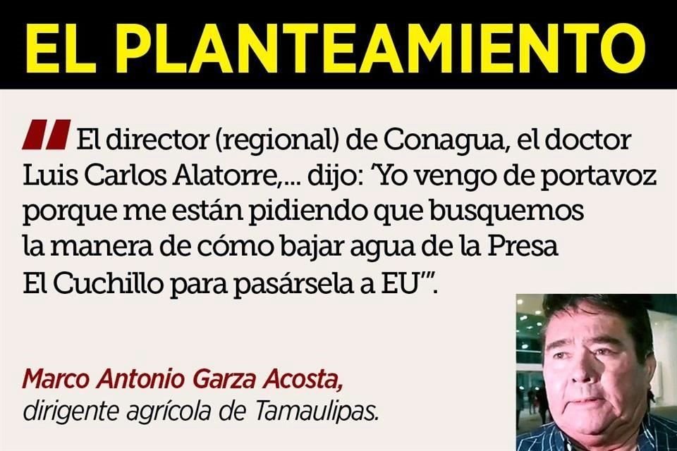 El delegado regional de la Conagua, Luis Carlos Alatorre, planteó usar el agua de la Presa El Cuchillo, la principal fuente de abasto para la población del área metropolitana de Monterrey, para abonar al adeudo del líquido que México tiene con Estados Unidos, afirmaron ayer agricultores de Tamaulipas.
