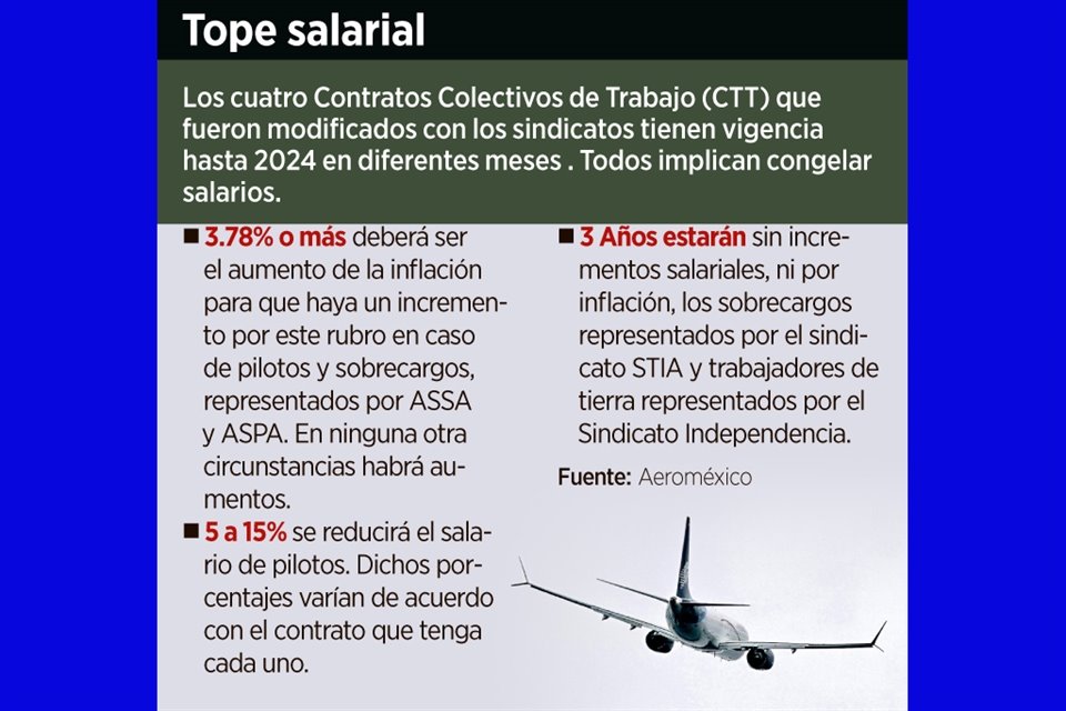 Aeroméxico ahorrará 685 millones de dólares en sus costos laborales durante cuatro años tras acordar con todos sus sindicatos el despido de 2 mil 540 empleados, congelar sueldos hasta 2024 y reducir salarios.