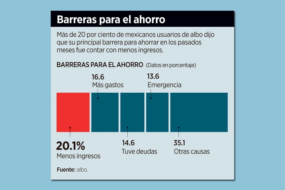 Contar con menos ingresos y tener mayores gastos fueron las principales barreras que tuvieron los mexicanos para ahorrar en los pasados meses de 2020, mostró una encuesta realizada a usuarios de la fintech albo en colaboración con Common Cents Lab de la Universidad de Duke.