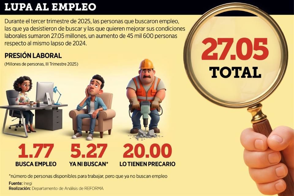 Lo anterior equivale a que la informalidad creció en 465 mil 887 personas respecto a julio-septiembre de 2024 a 32 millones 990 mil 238, cifra máxima histórica, y sumó dos trimestres con alzas.
