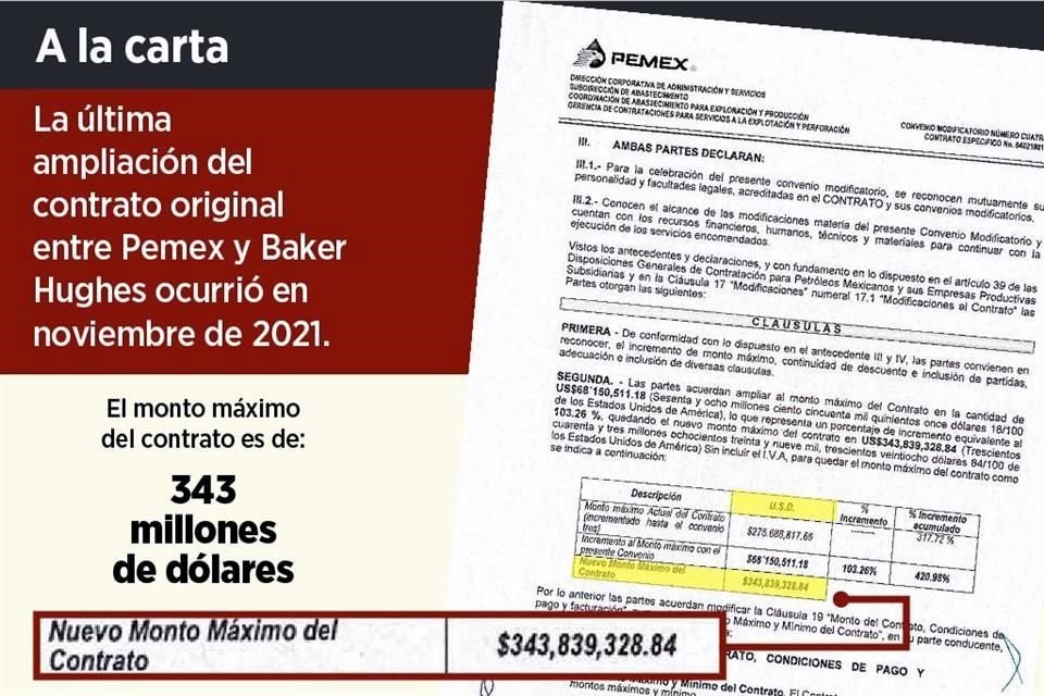 Documentos públicos consultados por Grupo REFORMA muestran que Pemex otorgó a Baker Hughes cuatro convenios de ampliación que modifican y multiplican por cinco la cifra máxima establecida originalmente en un contrato firmado en 2018.