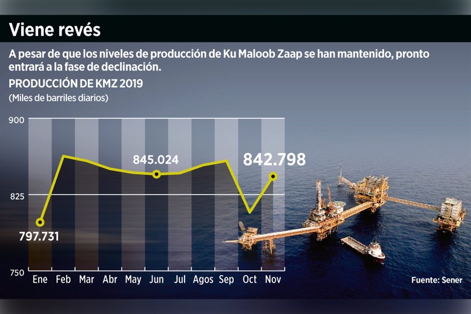 La rápida declinación que sufrió la entonces joya petrolera de México, Cantarell, se anticipa para el campo que ahora aporta la mayor producción de Pemex: Ku Maloob Zaap.