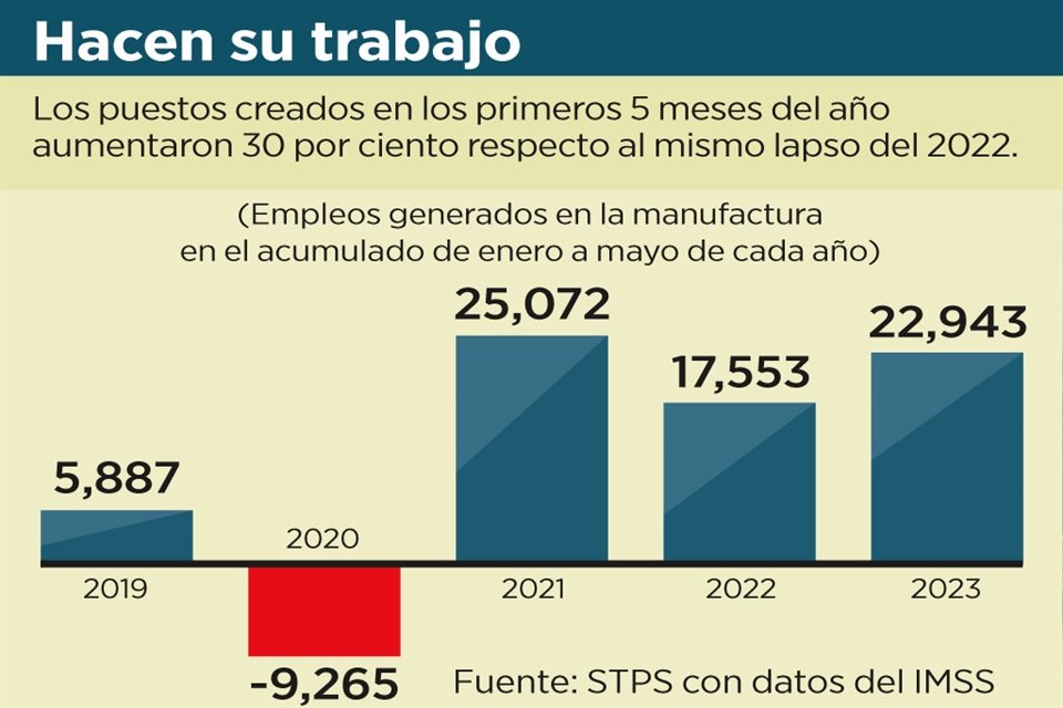 De enero a mayo de este año, las manufacturas de Nuevo León generaron 22 mil 943 empleos formales, que representan un aportación del 14.6 por ciento a nivel nacional en este sector.