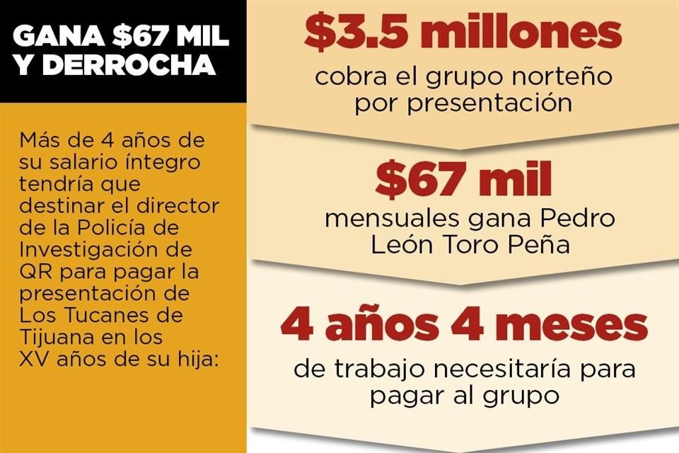Con Los Tucanes de Tijuana en el escenario, Pedro León Toro Peña, director de la Policía de Investigación de Quintana Roo, le armó el pasado 18 de mayo una fiesta de XV años a lo grande a su hija María Fernanda.