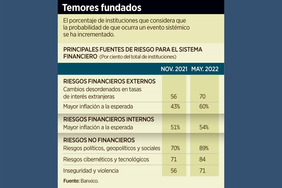 Una inflación mayor a la esperada se ubicó entre los principales riesgos externos e internos para el sistema financiero en México.