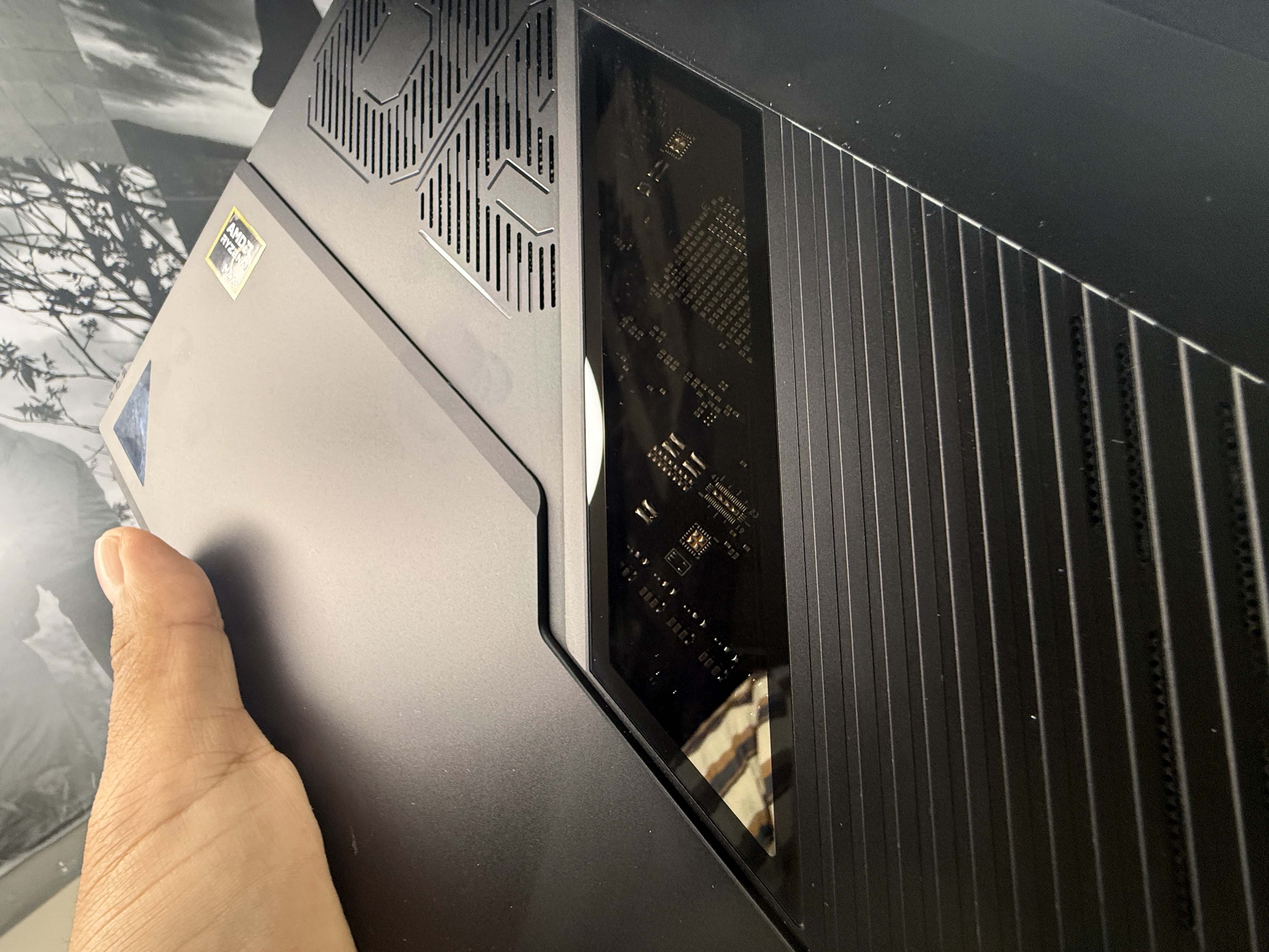 El chasis color negro, fresado mediante computadora, grita "retrofuturismo" a los cuatro vientos, evocando la cultura "cyberpunk" que tanto nos gusta romantizar. Detrás hay una "ventana" cristalina, iluminada con luces RGB, que deja entrever las entrañas de alto rendimiento de la placa base.