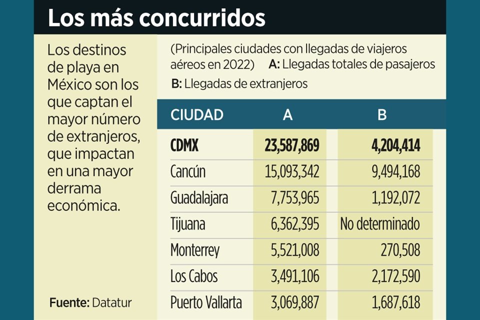 En México, 28.11 por ciento del total de los vuelos realizados en 2022, especialmente de viajeros extranjeros, aterrizaron en un destino de playa.