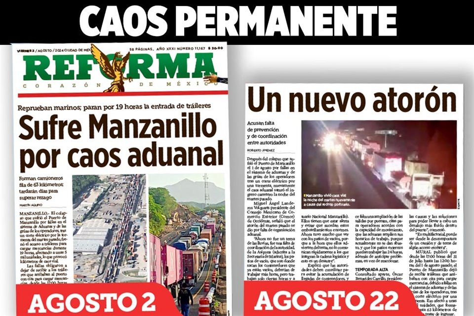 Nueva falla en sistemas para ingreso de mercancía en Puerto de Manzanillo tiene atorados 16 buques y cientos de contenedores y camiones. Crédito: Especial.