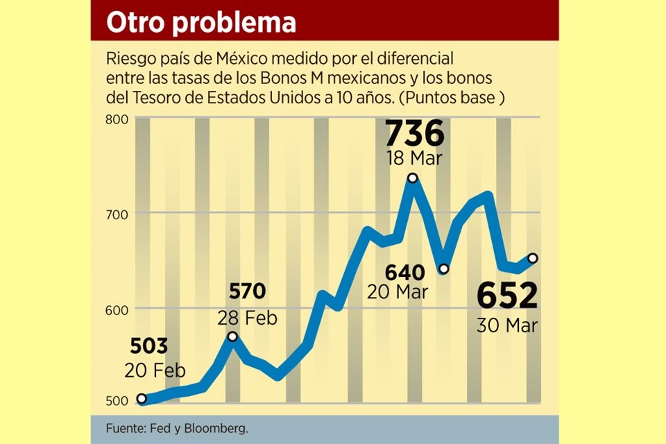 Del 20 de febrero a ayer 30 de marzo, el riesgo país de México se disparó 30 por ciento, alcanzando niveles no vistos desde octubre del 2008, en plena crisis financiera.