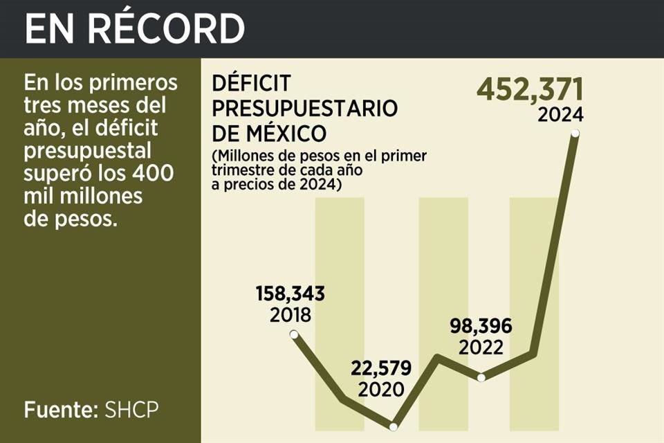 En el primer trimestre de este año, último del actual Gobierno federal, el déficit presupuestario de México se disparó 248.8 por ciento respecto al mismo periodo de 2023 al llegar a 452 mil 371 millones de pesos.