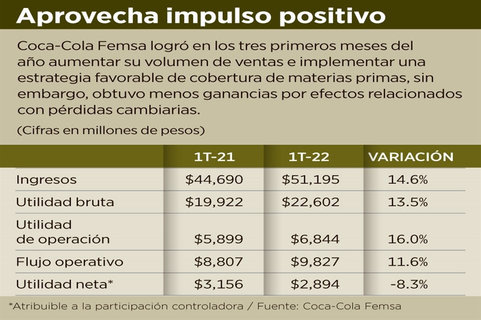 Debido a un incremento en volumen impulsado por Sudamérica, a mayores ingresos, a eficiencias operativas y a un tipo de cambio favorable, en el primer trimestre del 2022 Coca-Cola Femsa (KOF) elevó su flujo de operación (Ebitda) 11.6 por ciento contra el mismo periodo del año previo.