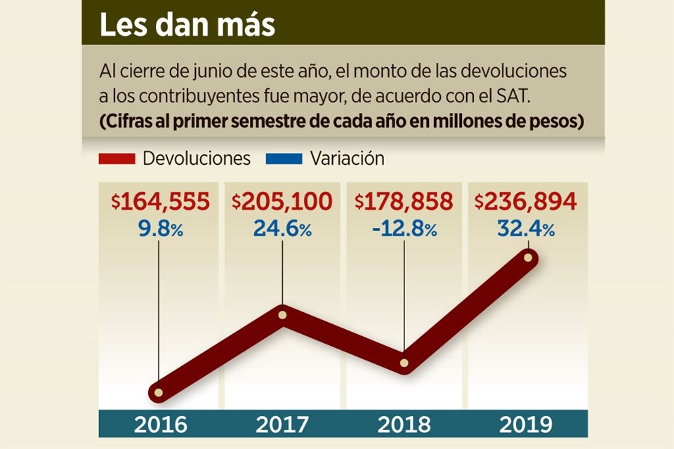 En el primer semestre de 2019, las devoluciones del Impuesto al Valor Agregado (IVA) en el País aumentaron 32.4 por ciento, respecto al mismo periodo del año pasado, de acuerdo con cifras del Servicio de Administración Tributaria (SAT).