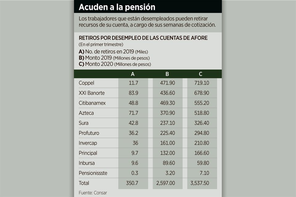 En el primer trimestre de 2020, el monto que los trabajadores retiraron por desempleo de su Afore creció 36.2 por ciento frente al mismo periodo de 2019, según datos proporcionados por la Comisión Nacional del Sistema de Ahorro para el Retiro (Consar).