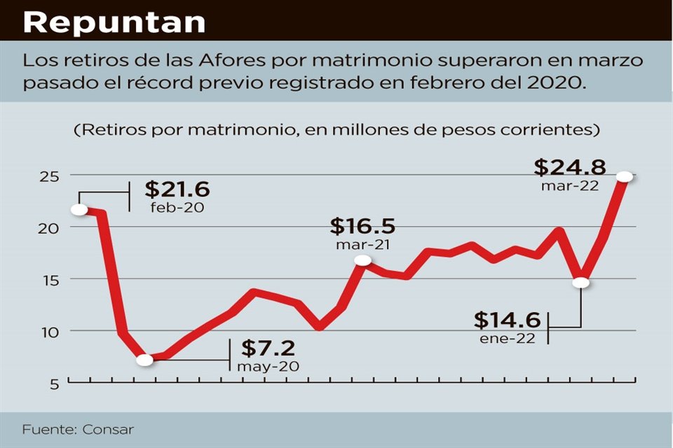 En marzo pasado, los retiros de las Afores por matrimonio anotaron un nuevo récord al llegar a 24.8 millones de pesos, 50 por ciento nominal más que en el mismo mes del 2021, muestran datos de la Comisión Nacional del Sistema de Ahorro para el Retiro (Consar).