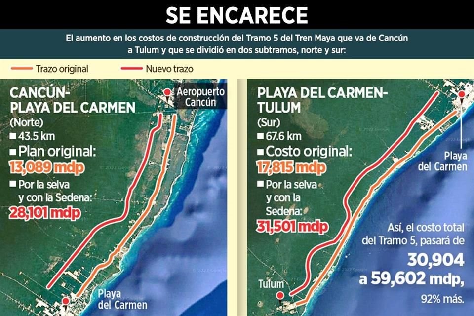 El costo de construir el Tramo 5 del Tren Maya a través de la selva de Quintana Roo aumentó en 92 por ciento, al pasar de 31 mil millones de pesos a 59 mil 603 millones de pesos, que saldrán por completo del erario.