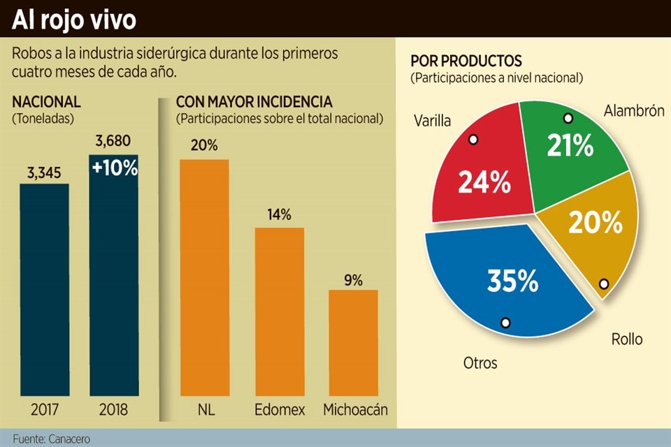 En los primeros cuatro meses del año en curso, Nuevo León retomó el liderazgo nacional en robos de acero, reveló Salvador Quesada Salinas, director de la Cámara Nacional de la Industria del Hierro y el Acero (Canacero).