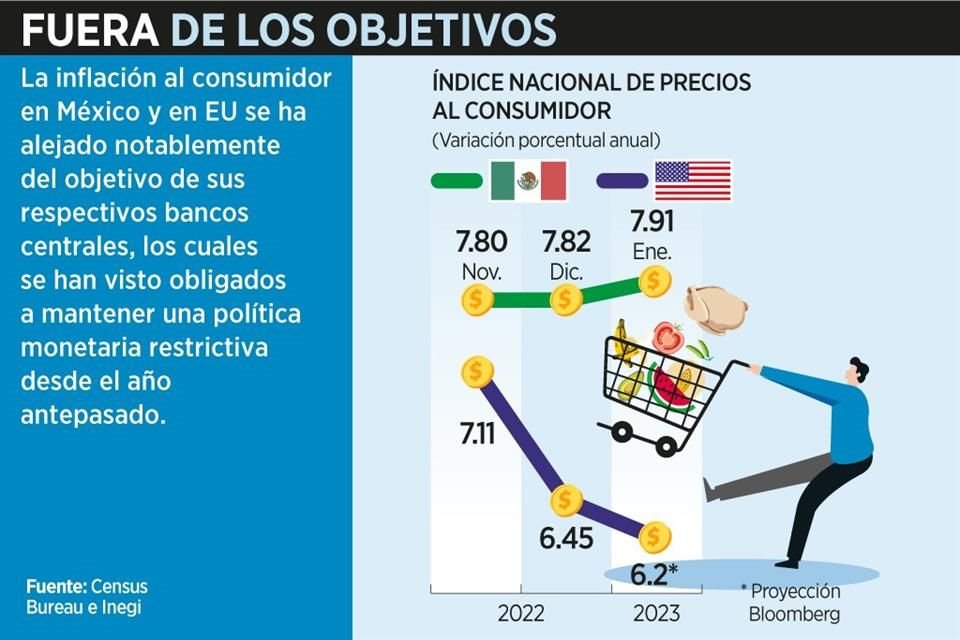 Mientras en EU la inflación se está moderando, en México no cede, pues en enero llegó a 7.91%, su mayor cifra para un mes igual desde 2001. Crédito: Alejandro Pastrana