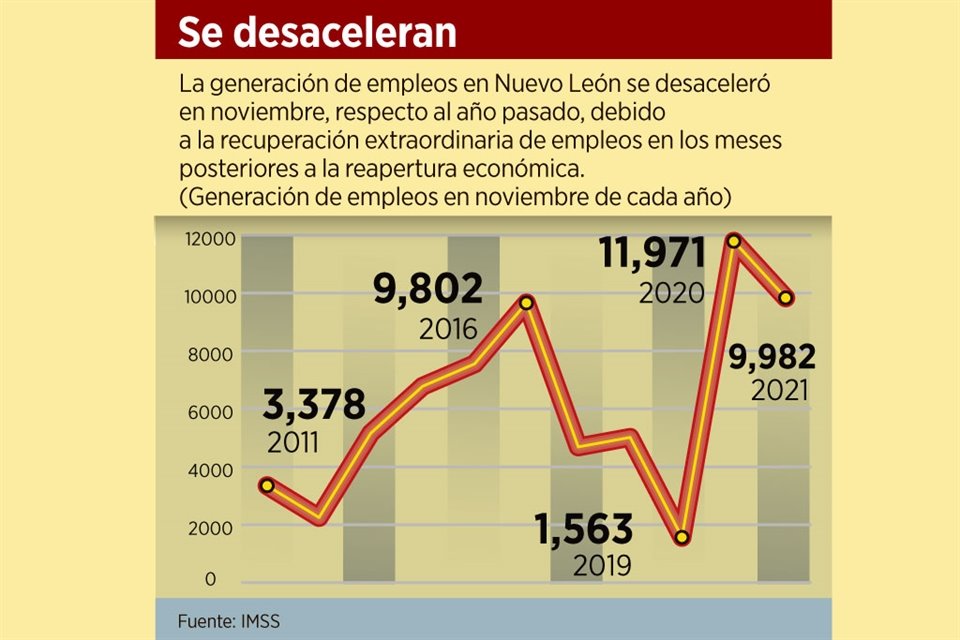 En noviembre, en Nuevo León se generaron 9 mil 982 empleos formales, cifra 16.6 por ciento menor respecto a los 11 mil 971 registrados en el mismo mes del año pasado.