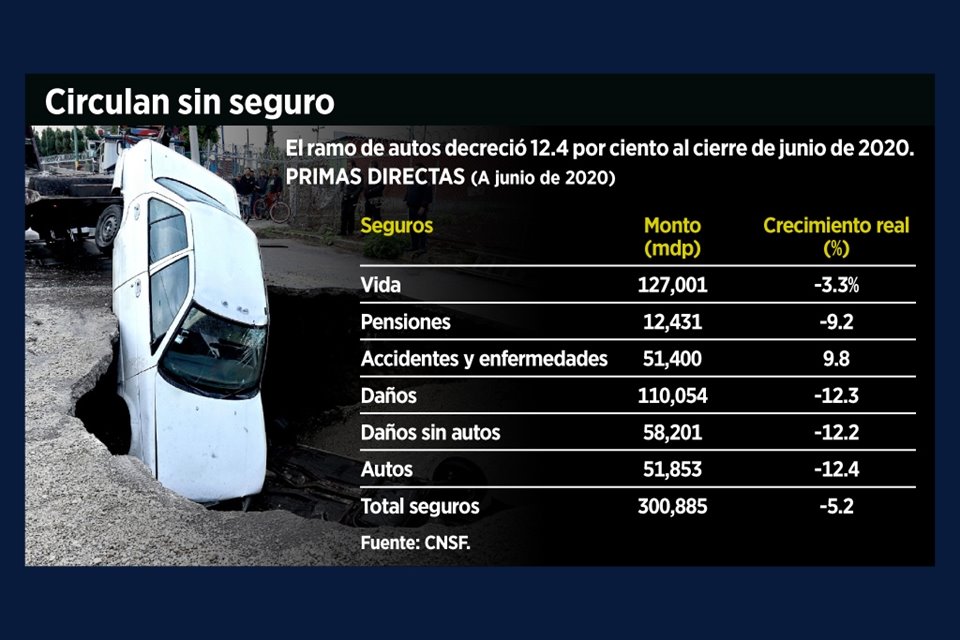 El sector asegurador sufre una caída en pólizas de autos que al cierre de junio de este año fue de 12.4 por ciento anual por efectos de la pandemia del Covid-19.
