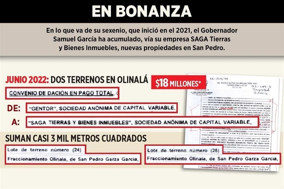En lo que va de su sexenio, que inició en el 2021, el Gobernador Samuel García ha acumulado, vía su empresa SAGA Tierras y Bienes Inmuebles, nuevas propiedades en San Pedro.