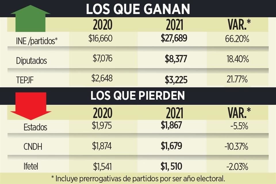 Mientras los Gobiernos estatales y algunos órganos autónomos recibirán menos recursos en 2021, la Cámara de Diputados prevé un aumento de casi mil 301 millones de pesos, justo cuando la mayoría de los legisladores buscará la reelección.