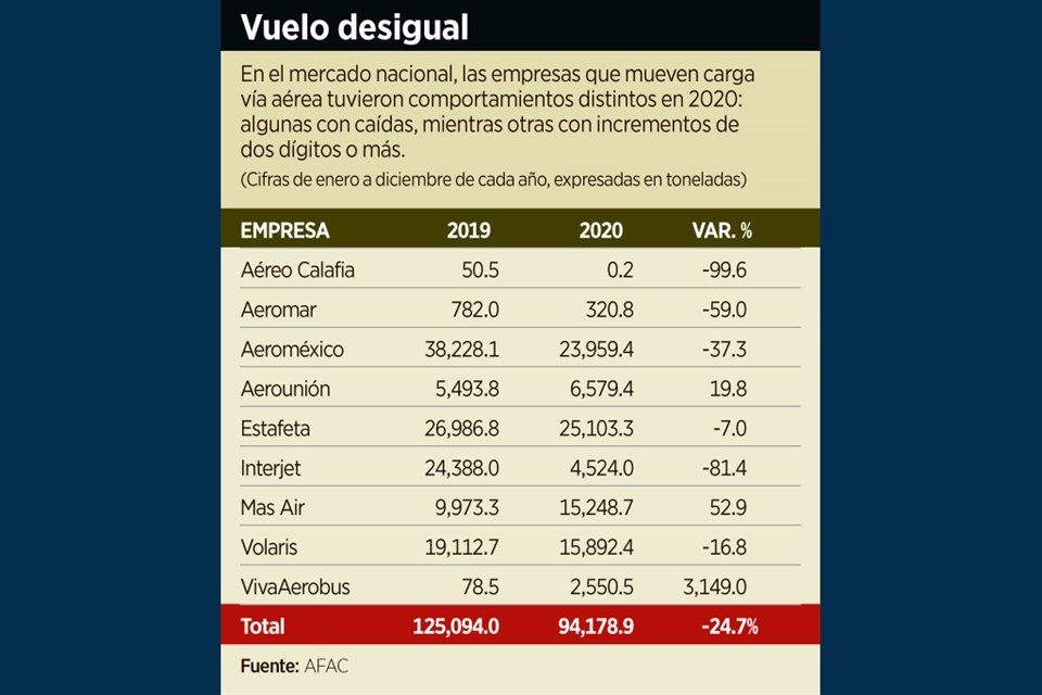 La carga aérea movilizada por aerolíneas mexicanas tuvo una caída anual de 24.7 por ciento en 2020, como efecto de la puesta en tierra de aviones.