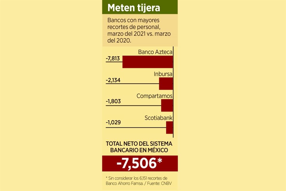 Al cierre de marzo pasado, los bancos comerciales en México registraron un recorte neto de 7 mil 506 empleos, o un 2.8 por ciento menos, respecto al mismo mes del 2020.
