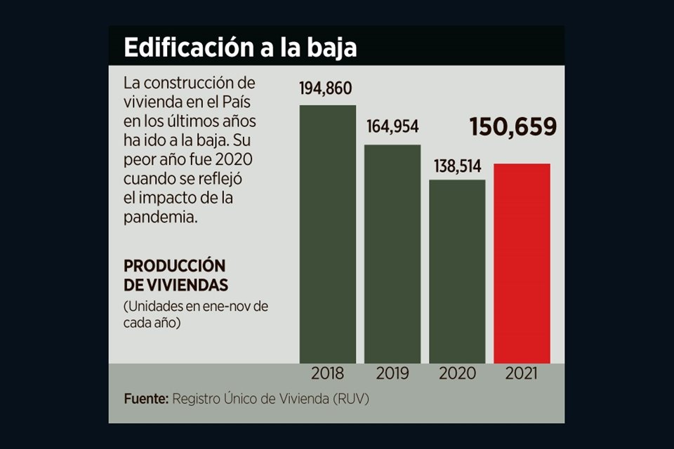 De enero a noviembre de este año, la producción de vivienda en el País registró una contracción de 8.6 por ciento comparado con el mismo periodo del 2019, previo a la pandemia del Covid-19, de acuerdo con el Registro Único de Vivienda (RUV).