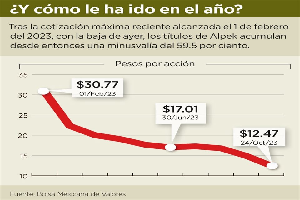 Tras la baja de sus resultados operativos del tercer trimestre del año publicados el pasado lunes, el valor de la acción de la petroquímica Alpek cayó ayer 9.64 por ciento, al cerrar en 12.47 pesos por título, nivel no visto desde mayo del 2020.