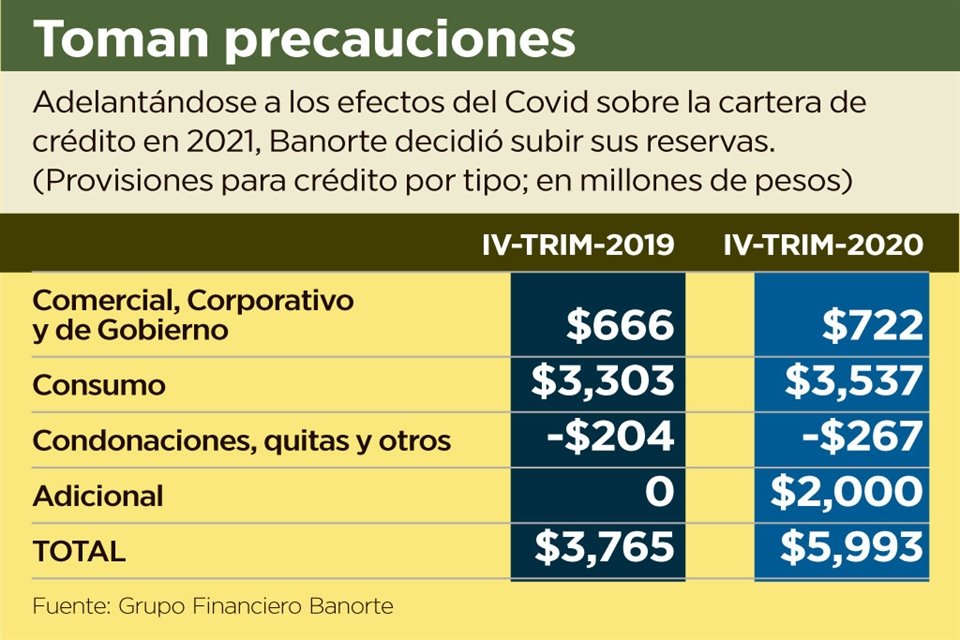 Debido a la necesidad de aumentar provisiones totales en 59 por ciento, ante los riesgos de impagos por el Covid, durante el cuarto trimestre del 2020 la utilidad neta de Grupo Financiero Banorte cayó 34 por ciento anual, a 5 mil 966 millones de pesos.