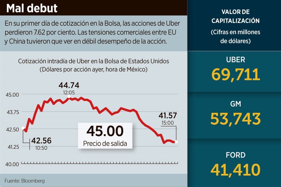 El estreno de Uber en Wall Street era una de las operaciones más esperadas este año y terminó arrancando de manera convulsa y con pérdidas de 7.56 por ciento, a 41.60 dólares por acción, pero aún así su valor de mercado quedó por arriba de las de GM y Ford, que tienen un siglo de existencia.