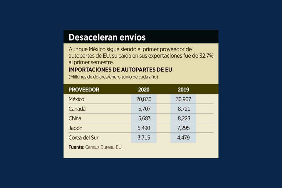 Durante el primer semestre del año, las exportaciones de autopartes a Estados Unidos cayeron 32.7 por ciento, de acuerdo con información del Census Bureau de ese país.