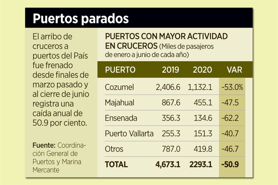 El freno de arribo de cruceros a puertos del País provocó que de enero a mayo se recibieran apenas 182.3 millones de dólares por ingresos de turistas, una caída anual de 36.7 por ciento respecto a 2019, como efecto de la pandemia.
