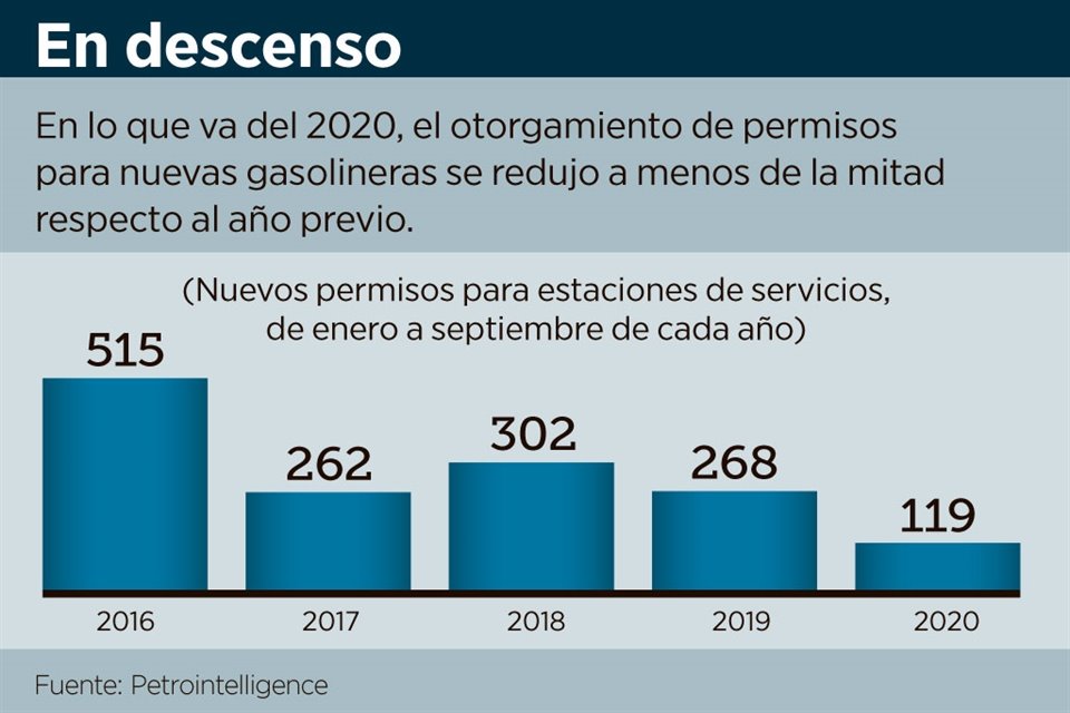 Durante los primeros nueve meses del año, la Comisión Reguladora de Energía (CRE) ha otorgado solamente 119 permisos de expendio de gasolina, un 55.6 por ciento menos que en el mismo periodo del año pasado.
