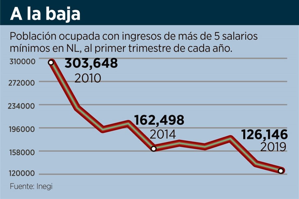 En los últimos 10 años, el número de quienes perciben más de 5 salarios mínimos (actualmente más de 15 mil 402 pesos al mes) se ha reducido 58.4 por ciento en Nuevo León.