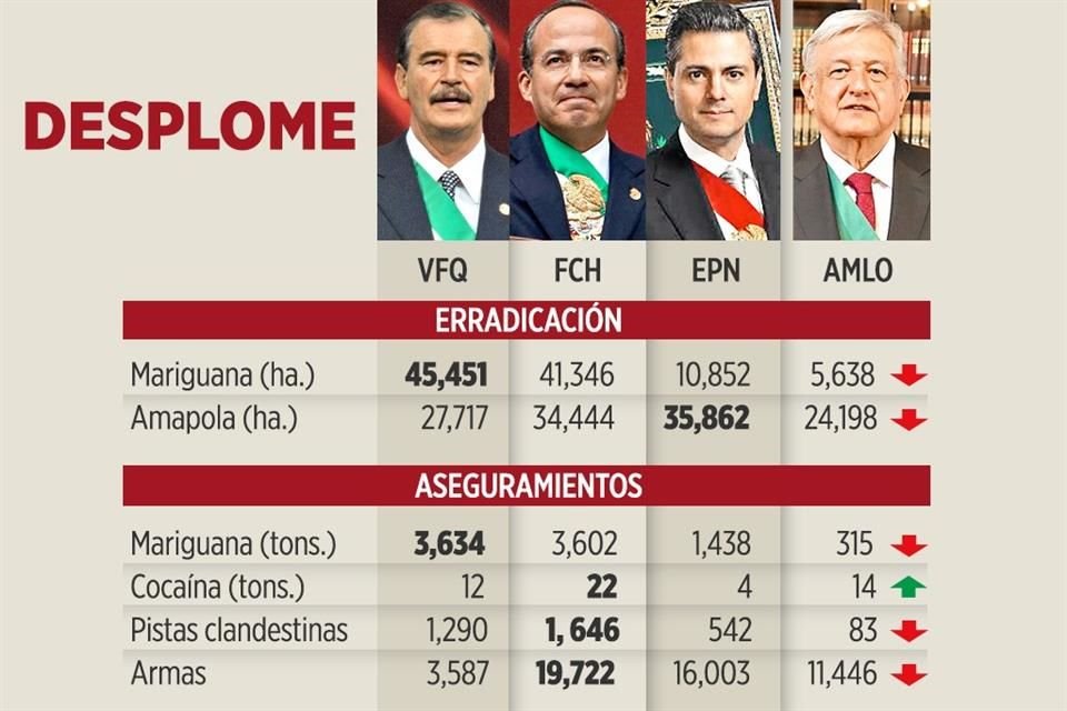 En el marco de la estrategia de abrazos y no balazos, los golpes asestados por la Secretaría de la Defensa Nacional (Sedena) al narcotráfico han ido a la baja.