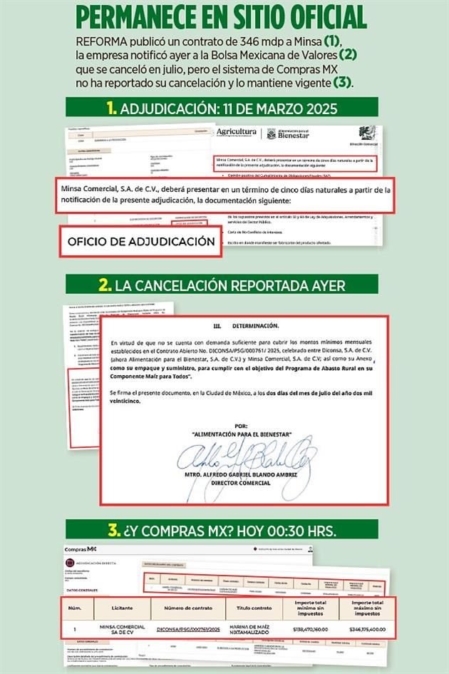 Tras difundirse el martes que Diconsa le adjudicó en marzo pasado un contrato por 346 millones de pesos, la empresa Minsa de Altagracia Gómez notificó ayer a la Bolsa Mexicana de Valores (BMV) que este convenio fue cancelado en julio pasado "sin que mediara un solo peso para la compañía".
