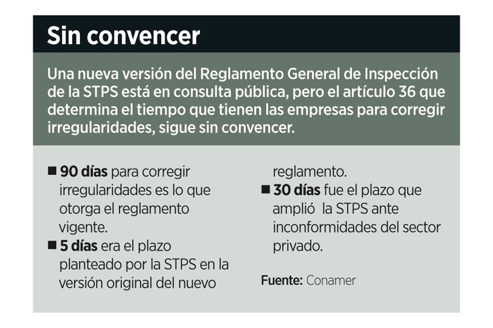 Ante inconformidades presentadas por los cambios al Reglamento de Inspecciones, la Secretaría del Trabajo (STPS) decidió modificar el proyecto para que las empresas tengan un plazo de 30 días para corregir irregularidades, en lugar de solo cinco que se habían planteado originalmente.