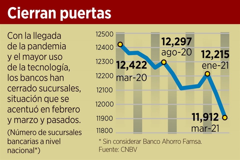 Al cierre de marzo pasado, el sistema bancario nacional reportó 11 mil 912 sucursales, 4.1 por ciento o 510 unidades menos que un año atrás, sin considerar el cierre de Banco Ahorro Famsa.