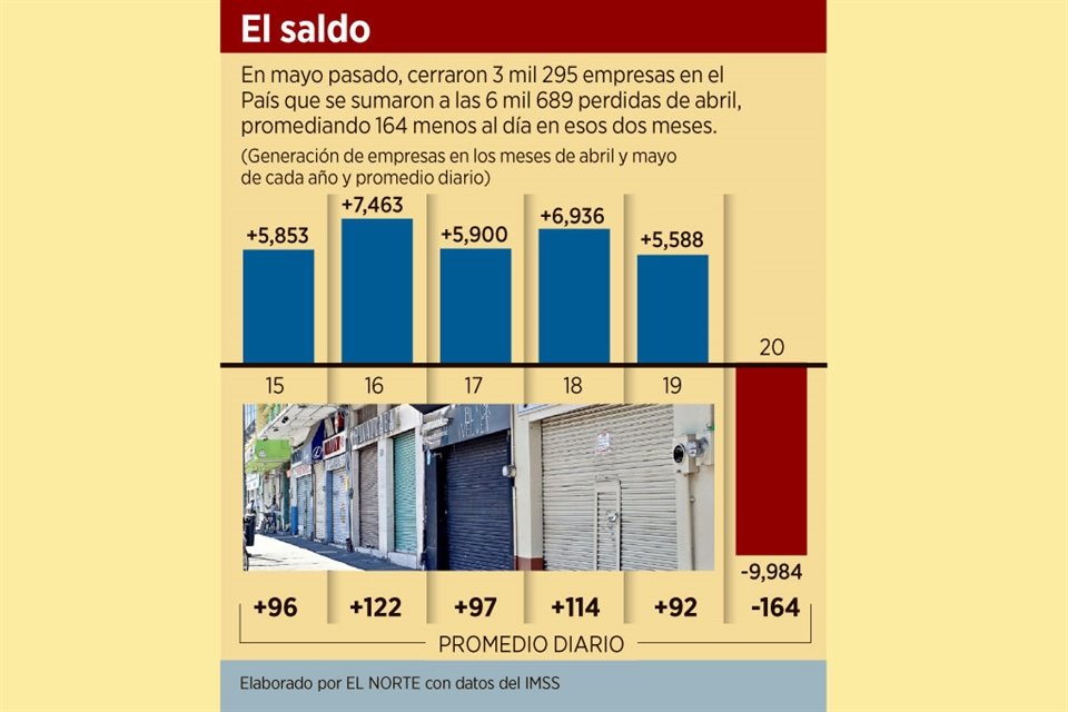 El impacto generado por la crisis del Covid-19 en México sigue quedando claro: en abril y mayo pasados bajaron la cortina 9 mil 984 negocios, lo que equivale a un promedio diario de 164 cierres, incluyendo sábados y domingos.