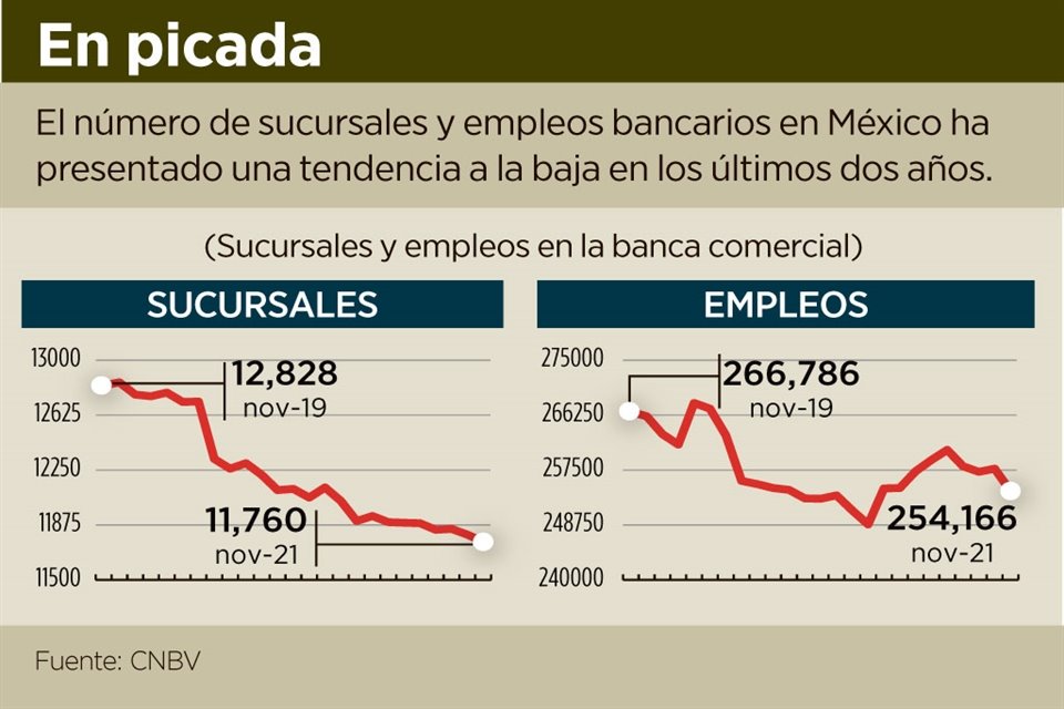 Al cierre de noviembre pasado, el sistema bancario mexicano reportó 11 mil 760 sucursales, 8.5 por ciento, o mil 89 unidades, menos que el máximo registrado en diciembre de 2019, antes de la pandemia.