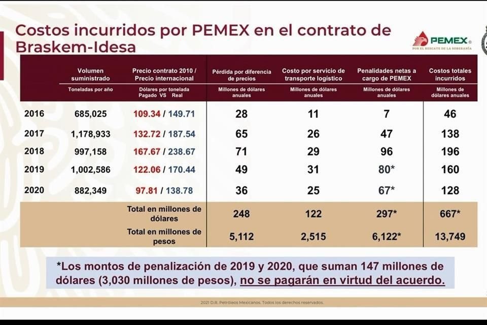 El Presidente Andrés Manuel López Obrador y el director de Pemex, Octavio Romero, anunciaron un acuerdo con Odebrecht que contempla reducir a menos de la mitad el suministro de gas etano a la planta de Braskem-Idesa en Veracruz, el cual presumieron generará un ahorro de 13 mil 749 millones de pesos.