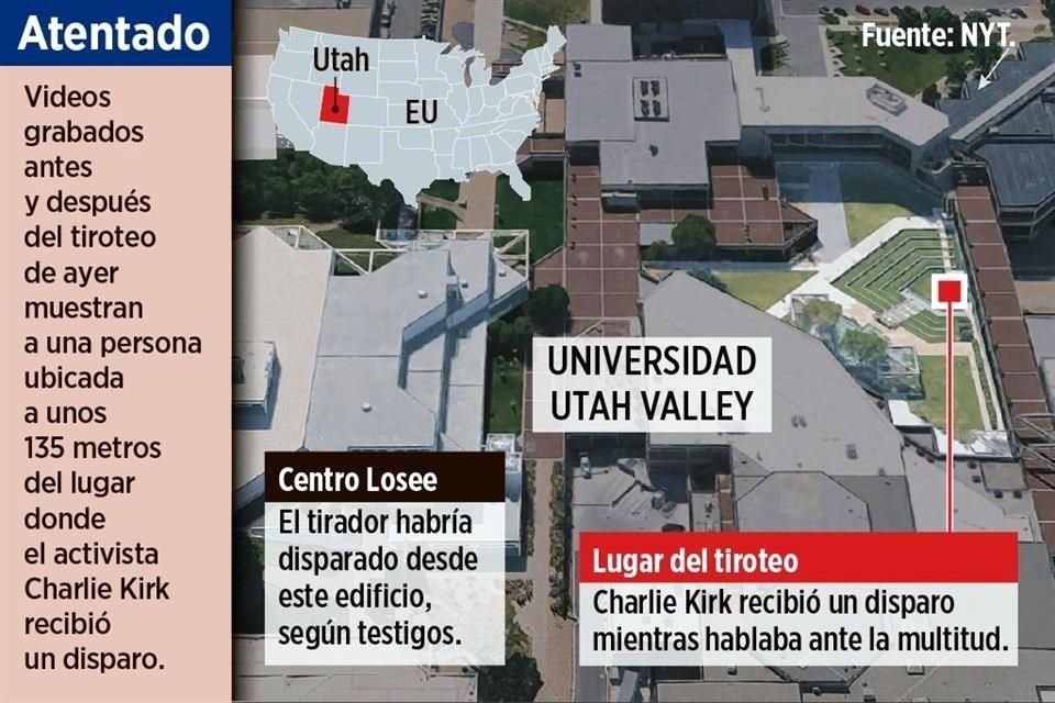El tirador habría disparado desde una azotea al cuello de Charlie Kirk, que estaba sentado, a casi 180 metros de distancia, según el NYT. Crédito: Especial